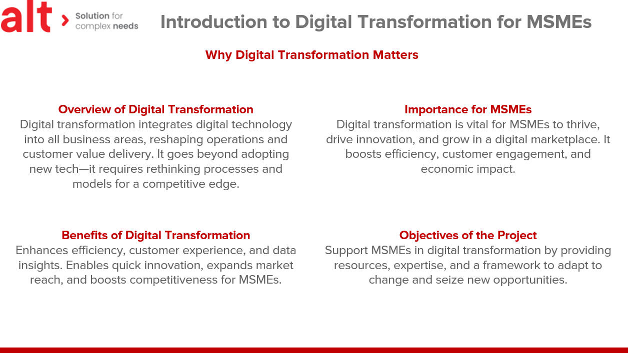 We at ALT are proud to be a part of consortium companies that provide such services, especially in the field of Digital Transformation Consultancy, to drive MSME's and Public Institutions into their Digital Transformation Roadmap.